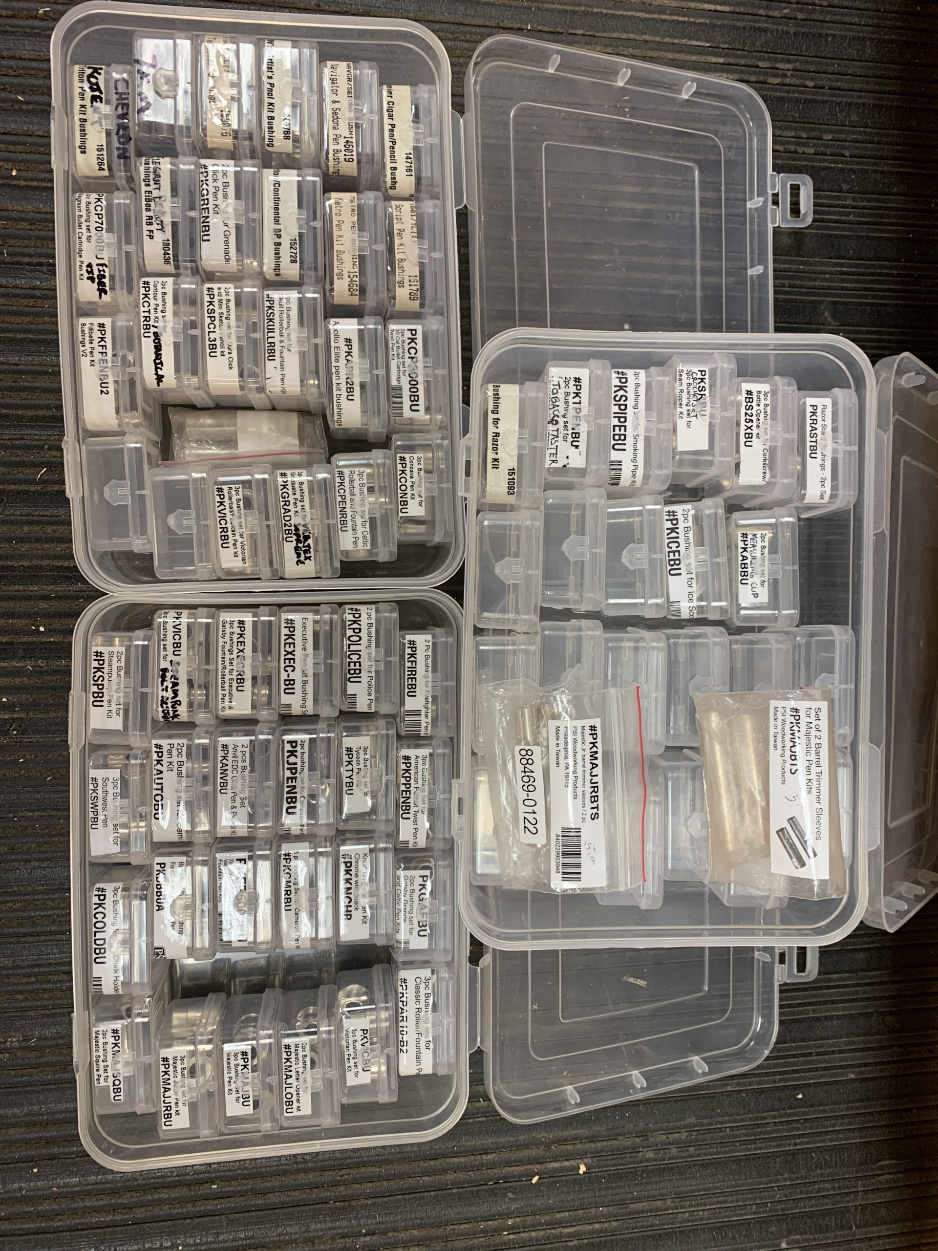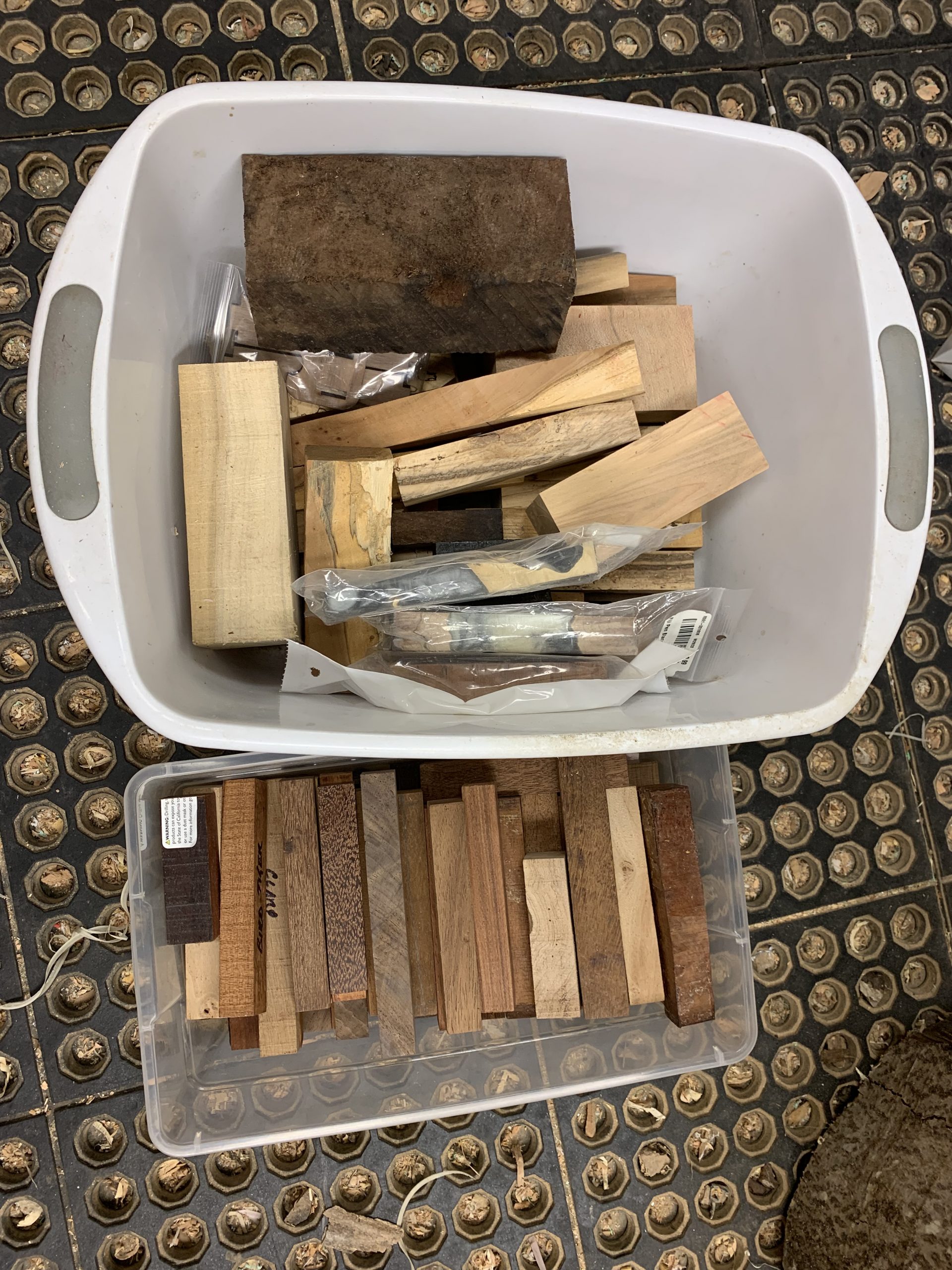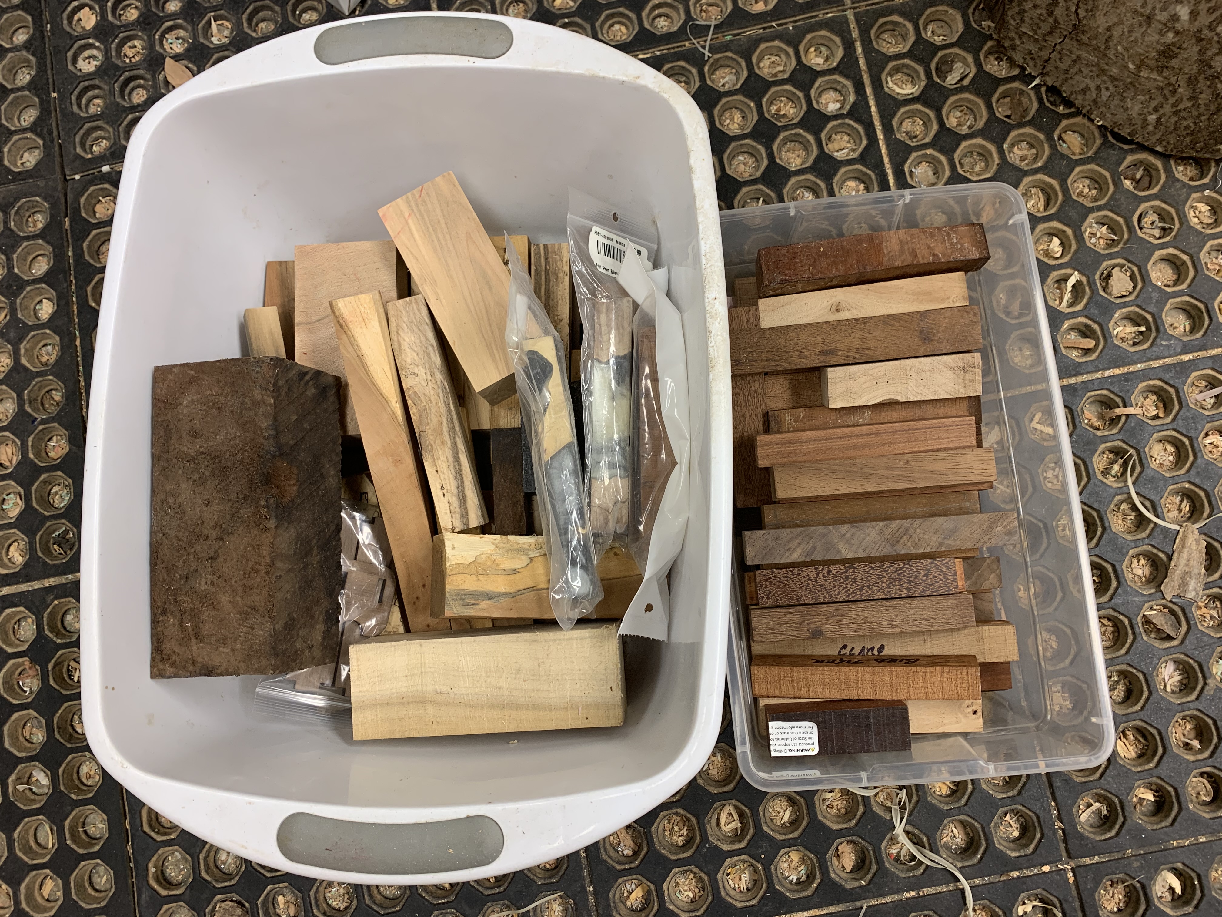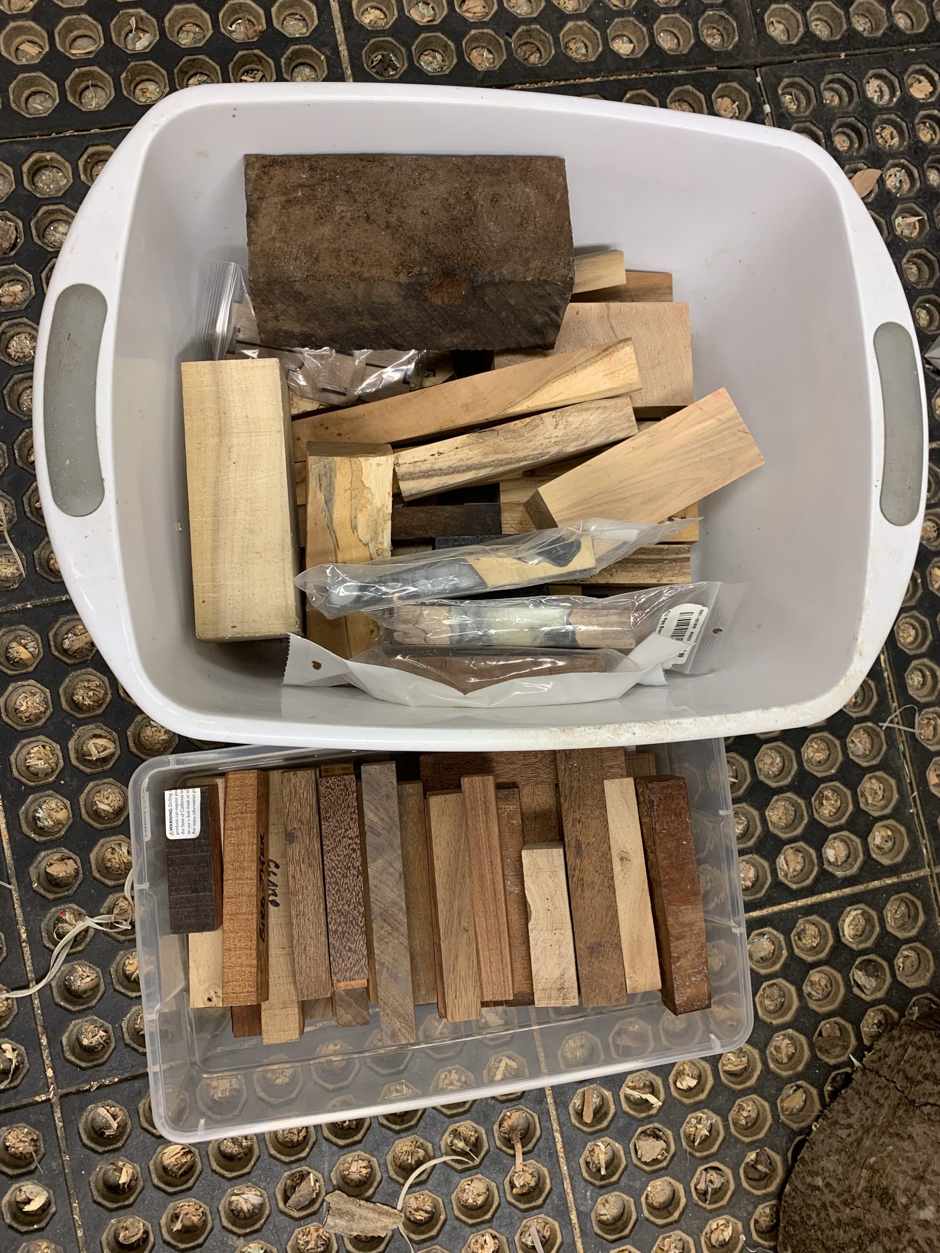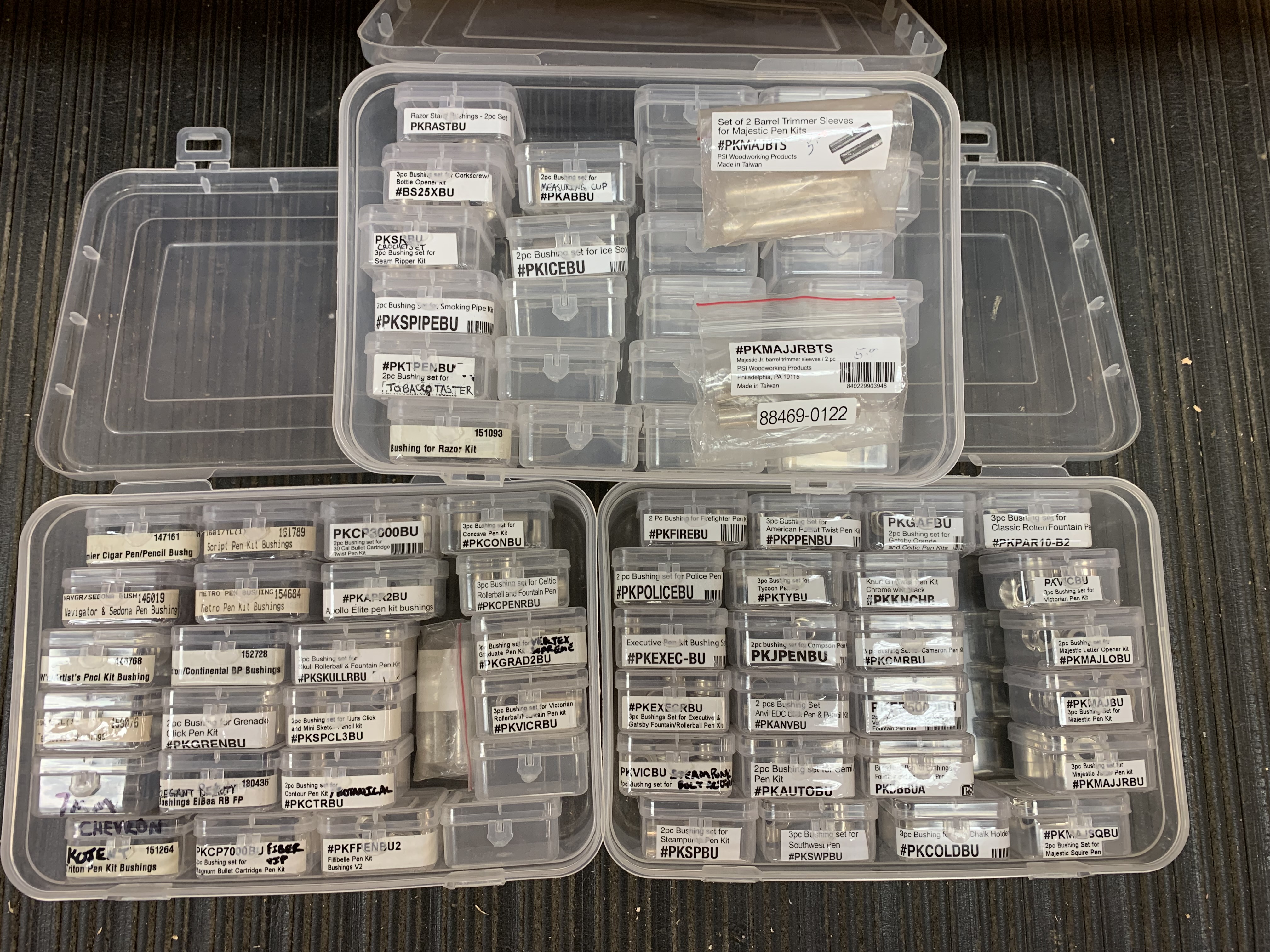All the plastic bins that are labeled have the item in them. Also 23 pen kits, 1 pizza cutter kit, tobacco taster kit, measuring cup kit, 12 pen gift boxes, 50 wood blanks, 2 duck calls and pen finishes.